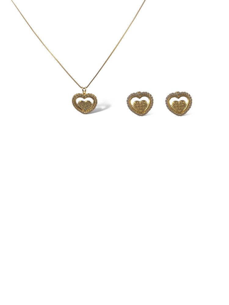 Conjunto Folheado 18k Coraçao Vazado com Zirconia ao Redor