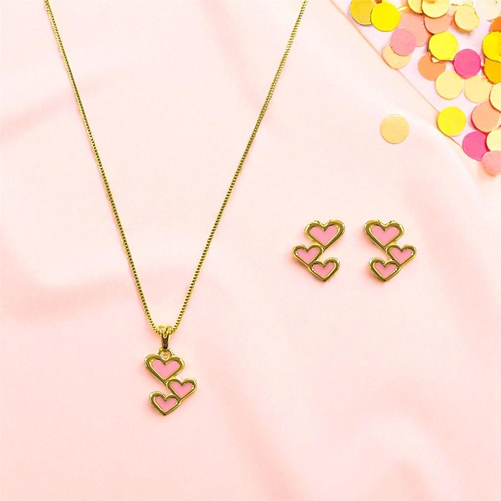 Encante-se com a delicadeza deste conjunto infantil folheado a ouro 18k, composto por um lindo colar com pingente e um par de brincos em formato de corações esmaltados na cor rosa. Uma joia leve, charmosa e cheia de amor, perfeita para meninas que adoram brilho e estilo.